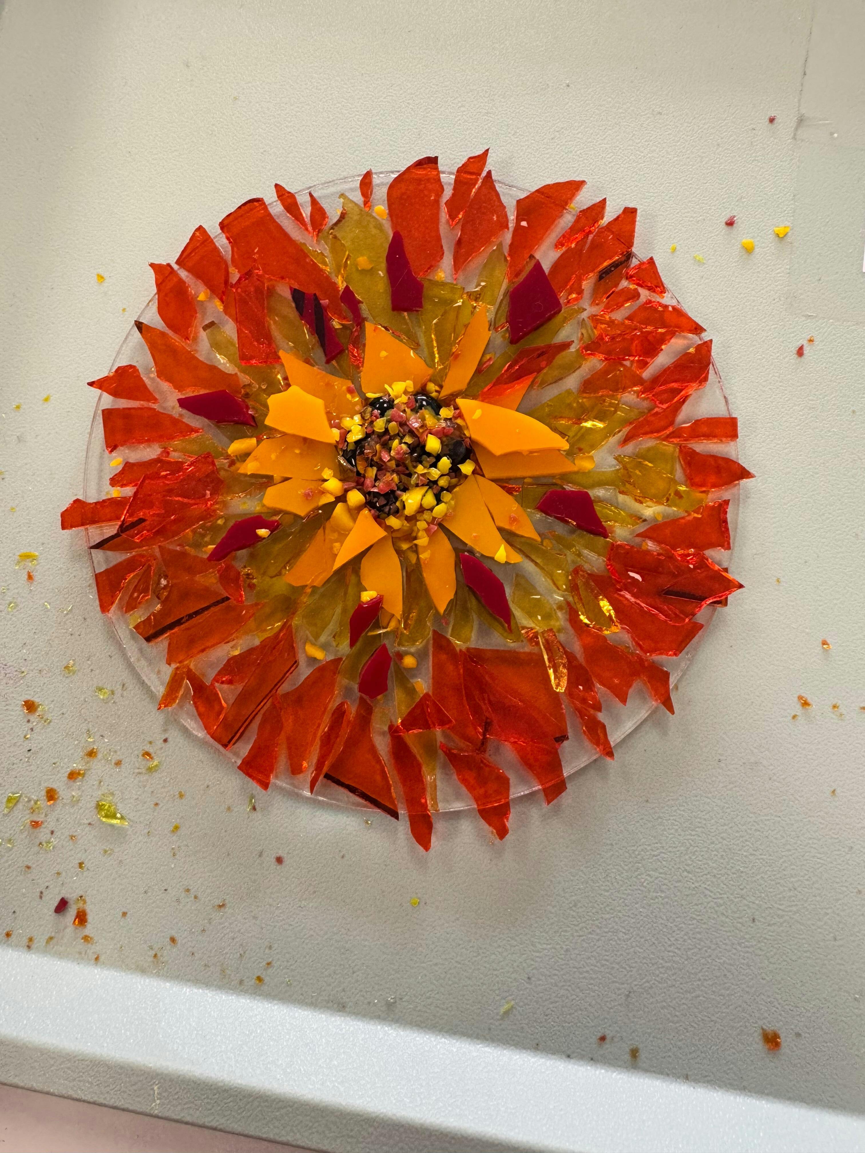Please note that this is mosaic style project meaning that we do not teach in-depth cutting techniques. If you are interested in learning more about glass cutting we would suggest taking one of our beginners stained glass classes!